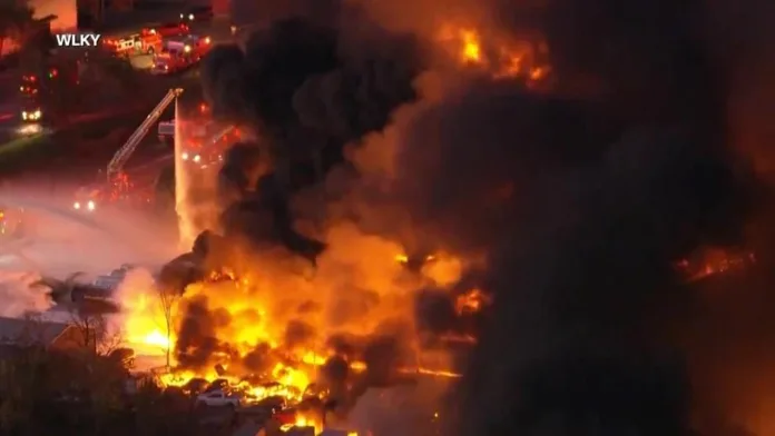 Television channel WLKY, a CBS affiliate, showed video of Tuesday’s crash, with flames visible as the plane took off, and the fireball erupting as it hit the ground. Several buildings in an industrial area beyond the runway were on fire after the crash, with thick, black smoke seen rising into the evening sky. Beshear said stricken facilities on the ground included a petroleum recycling center and an auto parts business.